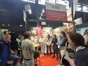 Notre stand est également un lieu qui cristallise les échanges entre les membres et avec les visiteurs, autour des productions des stations (jus de pomme, carottes, endives, pommes, poires, noix et noisettes salées et sucrées !).